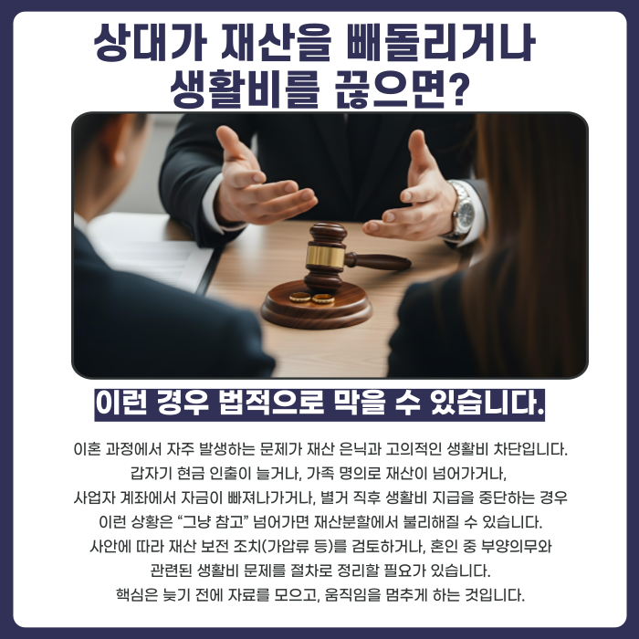 이혼 과정에서 빈번한 문제가 재산을 숨기거나 급하게 처분하는 움직임, 그리고 생활비를 끊는 행동입니다. 예를 들어