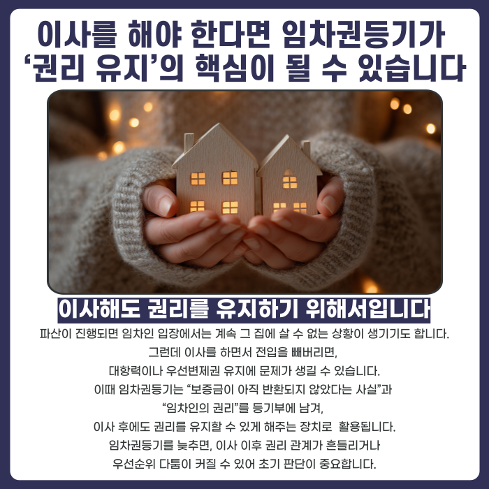 임차권등기를 늦추면 우선순위 다툼이 커지거나, 권리 관계가 불안해질 수 있어 타이밍이 중요합니다.