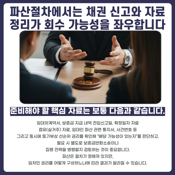 그리고 등기부를 통해 선순위 구조를 확인한 뒤, 배당만으로 부족할 수 있다면 보증금반환소송이나 집행 전략을 병행할지 검토해야 합니다. 파산 자체는 법원 절차지만, 임차인이 어떤 자료를 어떤 방식으로 갖추느냐에 따라 결과가 달라질 수 있습니다.