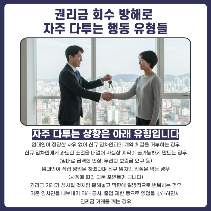 현장에서 권리금 회수 방해로 많이 거론되는 사례 유형은 다음과 같습니다.