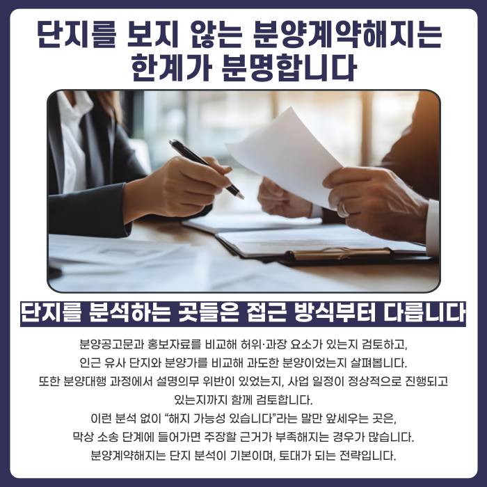 이 때문에 단지 분석 없이 진행되는 분양계약해지는 소송으로 가더라도 불리해질 가능성이 높습니다.