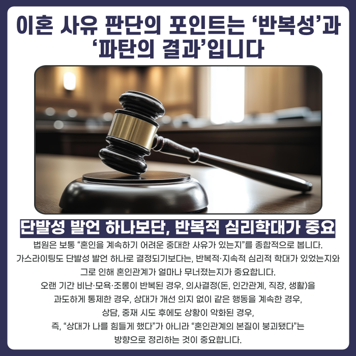 가스라이팅이 이혼 사유로 인정되려면, 단발성 발언 하나보다 반복되는 구조가 중요합니다.