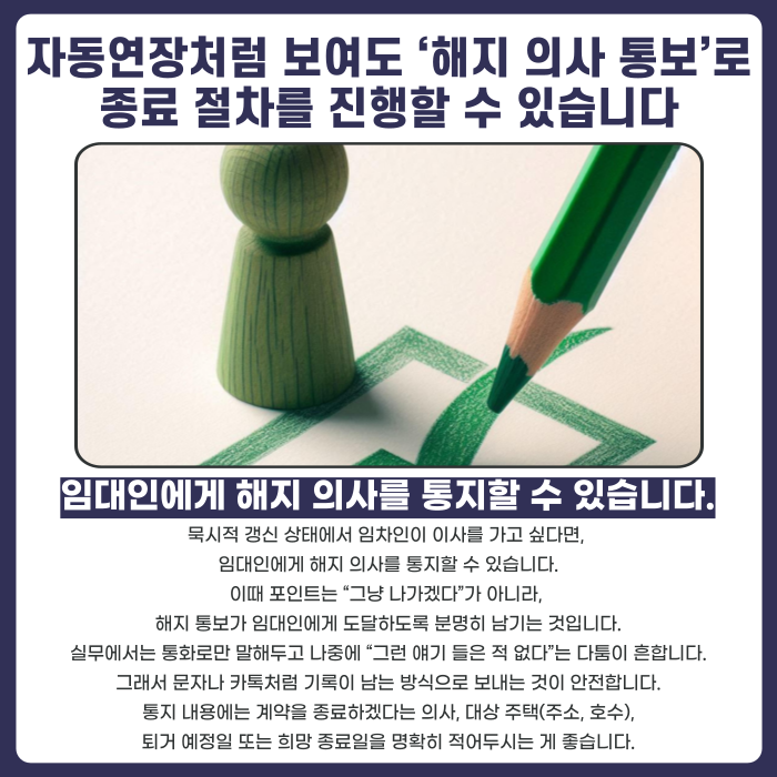 이번 글에서는 묵시적 갱신 상태의 임대차를 종료하려면 무엇을 조심해야 하는지 실무 기준으로 정리해드립니다.