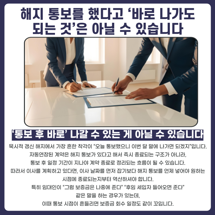 묵시적 갱신 종료에서 가장 흔한 실수는 “오늘 통보했으니 이번 달 말에 나가면 되겠지”라고 생각하는 것입니다.