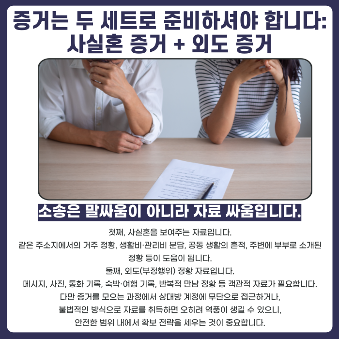 증거는 두 세트로 준비하셔야 합니다: 사실혼 증거 + 외도 증거