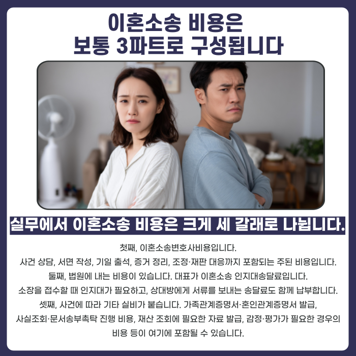 따라서 “이혼소송 비용은 변호사비만 보면 된다”가 아니라, 법원 비용과 실비까지 합쳐서 총액으로 보셔야 합니다.
