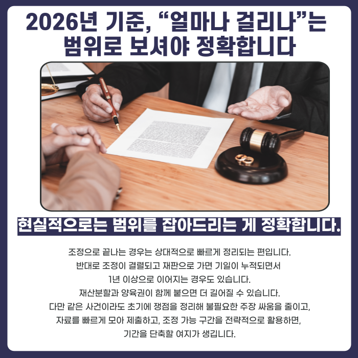 여기에 재산분할과 양육 이슈가 함께 붙으면 이혼소송 기간이 더 늘어날 가능성이 큽니다.