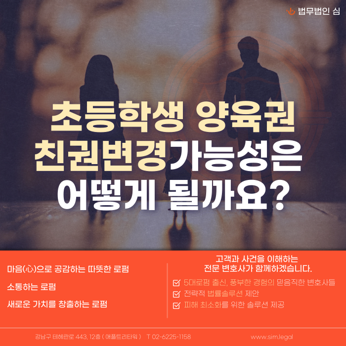 초등학생 자녀의 양육권 또는 친권 변경 문제로 고민 중이라면, 법무법인 심과 상담하시어 자녀를 위한 최선의 해답을 찾아보시길 바랍니다.
