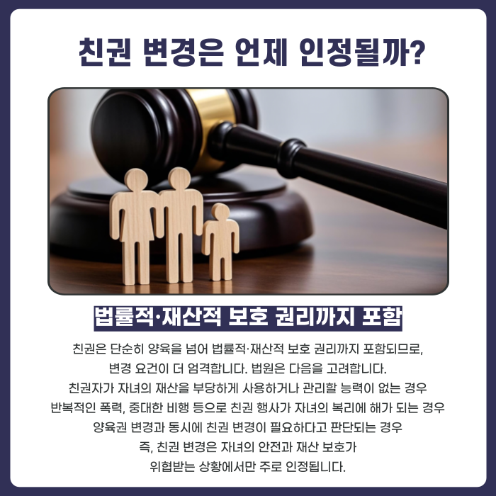 친권 변경은 단순한 양육 문제가 아닌 법적·재산적 권한까지 포함하기 때문에 요건이 더욱 엄격합니다.