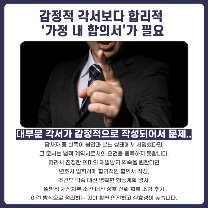 이혼이나 별거를 고민하는 부부 사이에서 감정이 격해지다 보면 “다시는 술 안 마신다”, “또 마시면 재산 전부 넘기겠다” 같은 각서를 쓰는 경우가 많습니다.