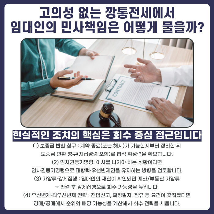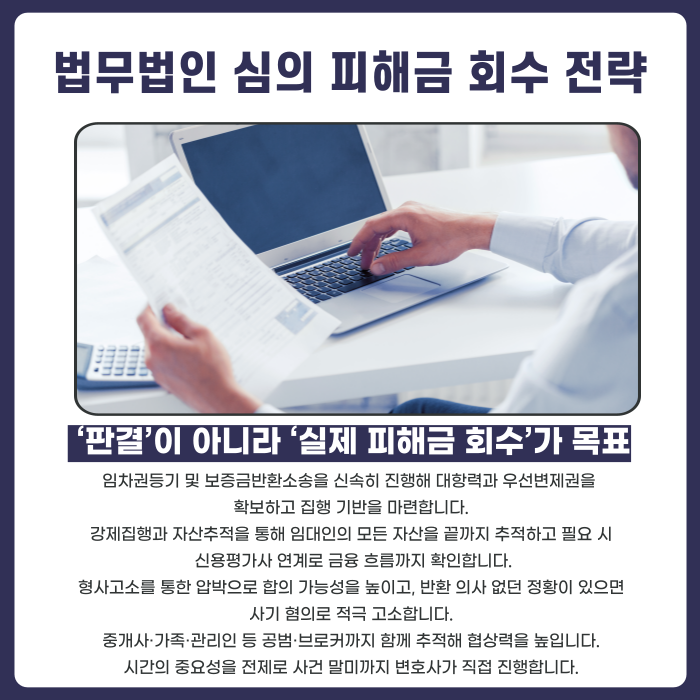 중요한 것은 형사만 바라보기보다 임차권등기·민사소송·집행·자산추적을 함께 설계해 회수 가능성을 최대화하는 것입니다.