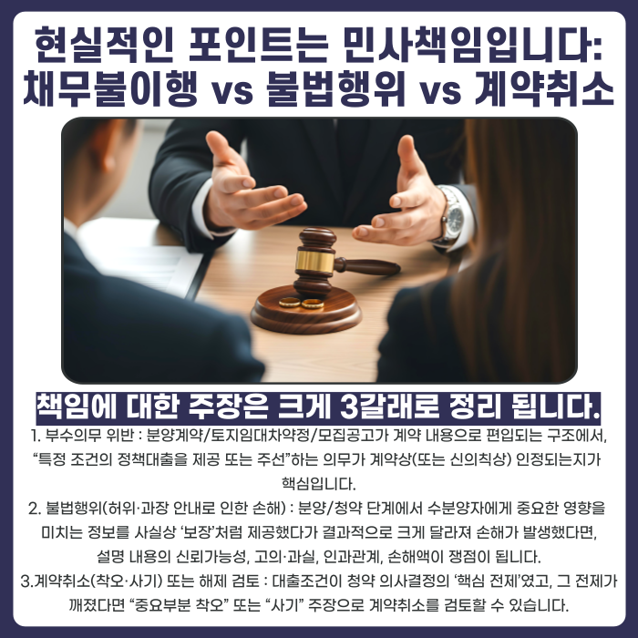 공식 안내가 사실상 보장처럼 전달되었고, 그로 인해 청약자가 합리적인 자금 계획을 세웠는데 결과가 크게 달라져 손해가 발생했다면, 설명 행위의 위법성과 과실, 인과관계가 쟁점이 됩니다. 이때는 손해를 “느낌”이 아니라 숫자로 만들어야 합니다. 예를 들어 추가 자기자금 부담, 대체 대출의 이자 비용, 계약 포기에 따른 불이익 등을 구체화하는 방식입니다. - 계약취소(착오) 또는 해제 가능성이 있는가