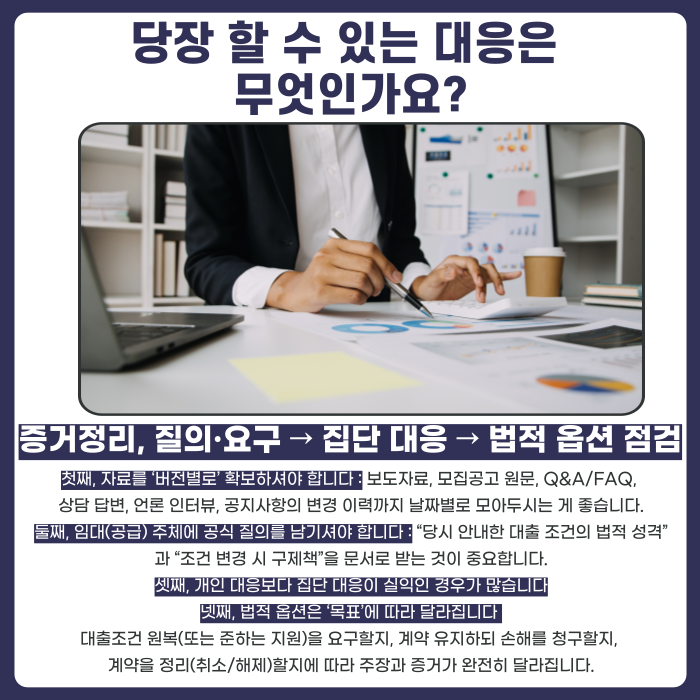 대출조건이 확정 사항이었는지, 변경 가능성이 고지되어 있었는지, 조건이 달라진 이유와 향후 보완책(추가 지원, 일정 유예, 패널티 완화 등)을 공식 답변으로 받아두는 것이 중요합니다. - 같은 단지라면 공동 대응이 실익이 큽니다