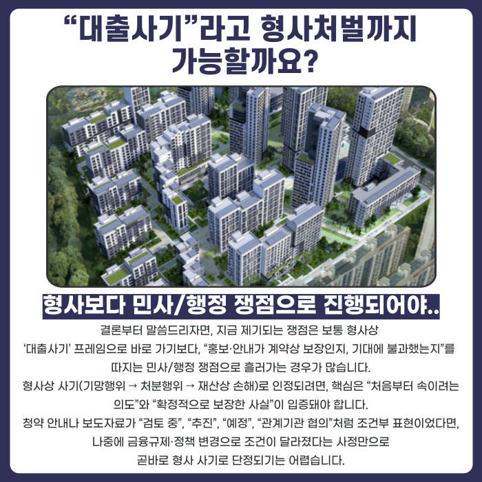 대출조건이 바뀌었다고 해서 곧바로 형사상 사기가 성립하는 것은 아닙니다. 형사 사기는 보통 “처음부터 속일 의사”와 “확정적인 기망”이 핵심인데, 정책대출은 관계기관 협의, 금융규제, 시장 상황에 따라 변동될 여지가 크기 때문입니다.