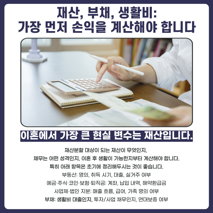 많은 분들이 “상대가 돈이 없다고 한다”는 말로 안심하거나 포기하시는데, 실제로는 명의 분산이나 현금 흐름을 통해 재산이 드러나는 경우도 적지 않습니다. 이혼을 생각하는 단계에서 재산의 큰 그림을 만들어두면, 협의든 소송이든 결과가 달라집니다.