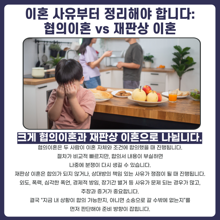 그래서 이혼을 고민할 때 첫 질문은 “합의가 가능한가”입니다. 합의가 어렵다면 처음부터 소송 흐름을 염두에 두고 준비해야 시간이 덜 새는 경우가 많습니다.