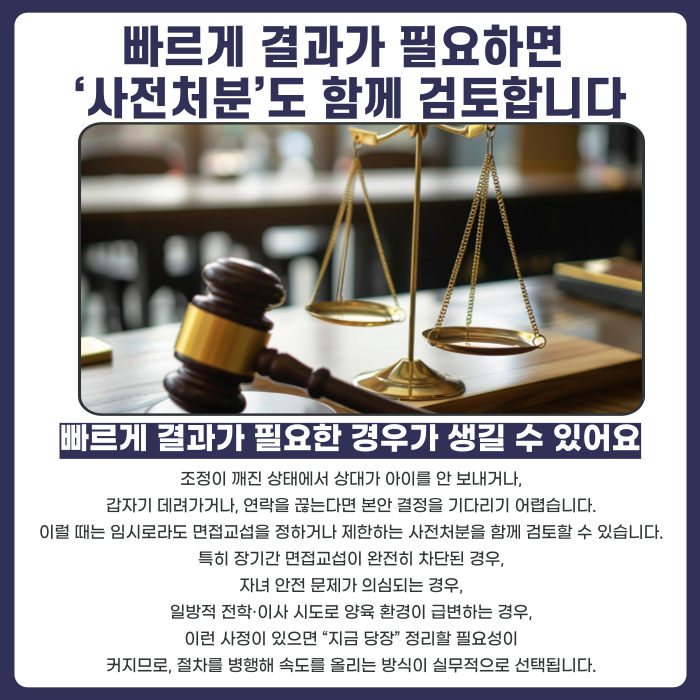 조정이 결렬된 뒤 상대가 아이를 아예 보내지 않거나, 연락을 끊거나, 갑자기 거처를 옮기는 등 상황이 악화되면 최종 결정까지 기다리기 어렵습니다. 이럴 때는 임시로 면접교섭을 정하거나 제한하는 사전처분을 함께 검토하는 경우가 있습니다.