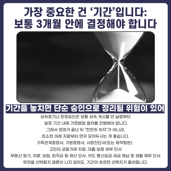 상속포기나 한정승인은 통상 상속 개시 사실을 알게 된 날을 기준으로 일정 기간 내에 가정법원 절차를 진행해야 합니다. 그래서 장례가 끝난 뒤에 생각하겠다고 미루다 보면, 필요한 선택을 못 하게 되는 문제가 생길 수 있습니다.