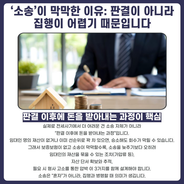 많은 분들이 “소송이 오래 걸릴까 봐” 고민하시지만, 실무적으로 더 중요한 문제는 소송이 아니라 판결 이후 집행이 가능한가입니다. 임대인 명의로 집행할 재산이 없거나, 이미 선순위가 다 가져가면 승소해도 회수가 막힙니다.