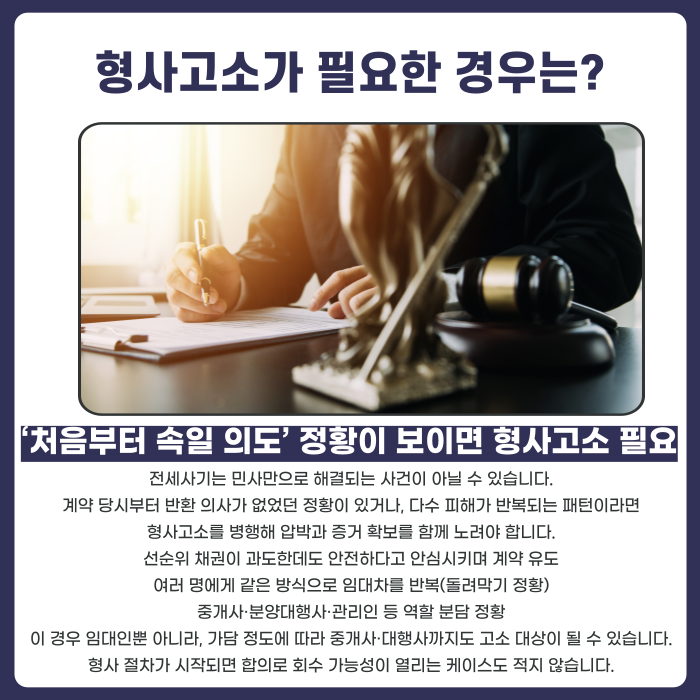 전세사기 사건은 민사만으로 해결되지 않는 경우가 적지 않습니다. 계약 당시부터 반환 능력이나 반환 의사가 없었던 정황, 다수 피해가 반복되는 패턴, 역할 분담이 있는 구조가 보이면 형사 절차를 함께 검토해야 합니다.