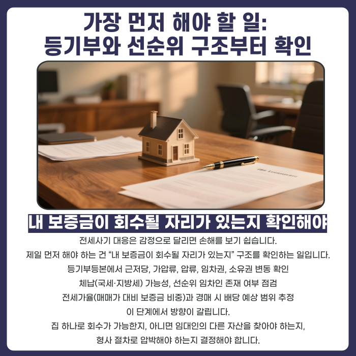 전세사기 사건에서 가장 먼저 해야 할 일은 “상대가 나쁜 사람인지”를 따지는 게 아니라, 내 보증금이 어디에서 회수될 수 있는지를 구조로 확인하는 것입니다.